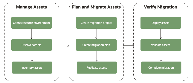 The Oracle Cloud Migrations workflow is comprised of three primary phases.